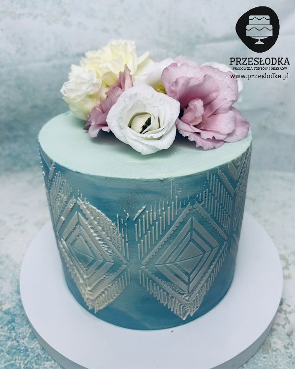 Tort niebieski ze wzorem przyozdobiony naturalnymi kwiatami - torty Piaseczno, Warszawa.