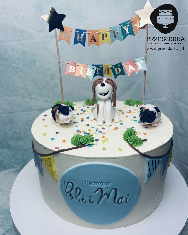 Tort z jadalnymi figurkami świnek morskich oraz psa. Tort urodzinowy dla dziewczynek, właścicielek tychże zwierząt - torty Piaseczno, Warszawa.