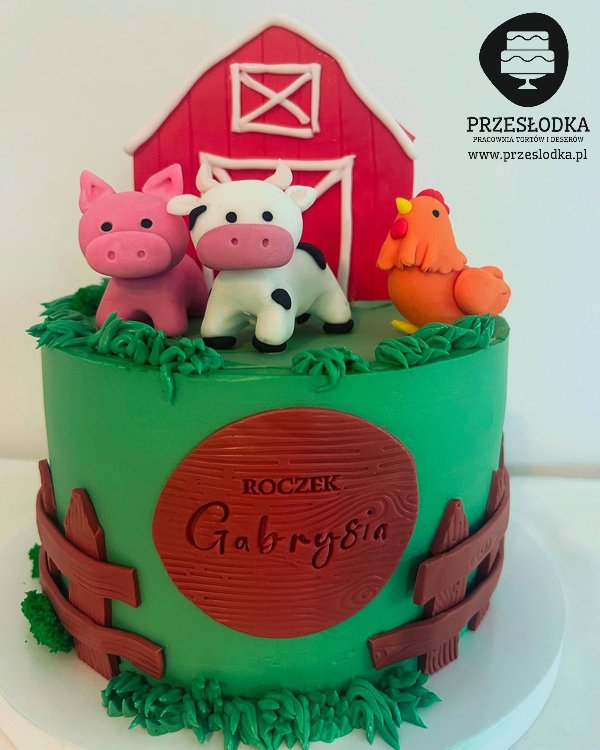 Tort w zielonym kolorze z oborą, świnką, krową oraz kurą - tort farma - torty Piaseczno, Warszawa.