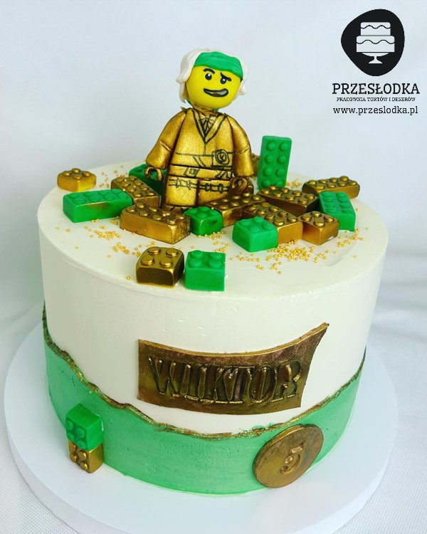 Biało-zielony tort z figurką złotego Lloyda, bohatera serii Ninjago - Mistrzowie Spinjitsu. Idealny tort dla młodego chłopca, który kocha tę bajkę i utożsamia się z bohaterami. Torty Piaseczno, Warszawa.