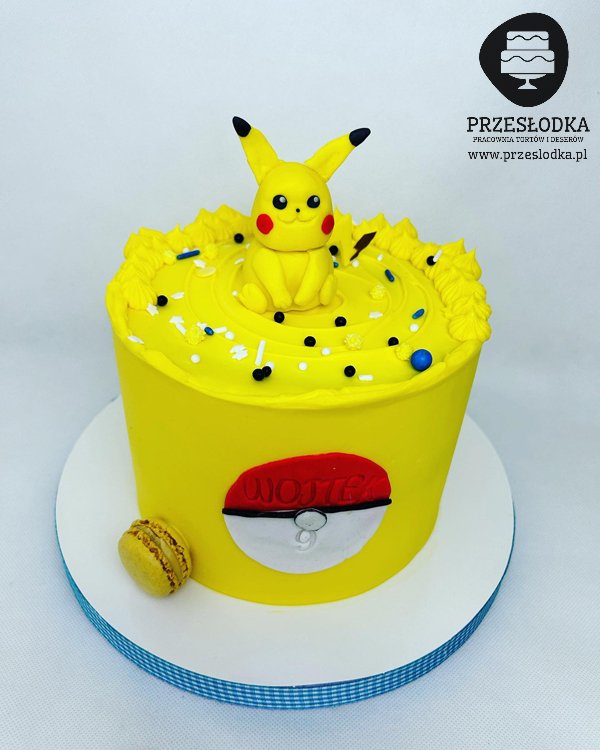 Tort w kolorze żółtym z figurką ręcznie robioną bohatera serialu animowanego Pokemony. Pikachu to najsłodszy z bohaterów. Jest Pokemonem typu elektrycznego, wprowadzonym w Generacji I. Pikachu to popularna maskotka serii Pokemon i jedna z głównych maskotek Nintendo. Torty Piaseczno, Warszawa.